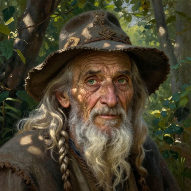 Craft a hyperrealistic portrait resembling an oil painting masterpiece, showcasing an aged sage with deeply etched wrinkles, misty green eyes, and long white hair loosely braided. Their expression exudes wisdom tinged with mischief, their gaze peering from beneath the brim of an intricately adorned hat. Set against lush foliage, sunlight filters through the canopy to cast dappled shadows on the subject's face and shoulders, evoking a serene reverence for nature's enduring enigma.