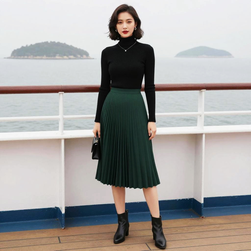 A slim woman in a classic vintage style, wearing a black ribbed turtleneck and a dark green pleated midi skirt, paired with black ankle boots and a small black clutch, stands on a ship deck with distant islands in the background. A thin silver necklace adds a touch of elegance. Sexy. Pretty face and beutiful eyes