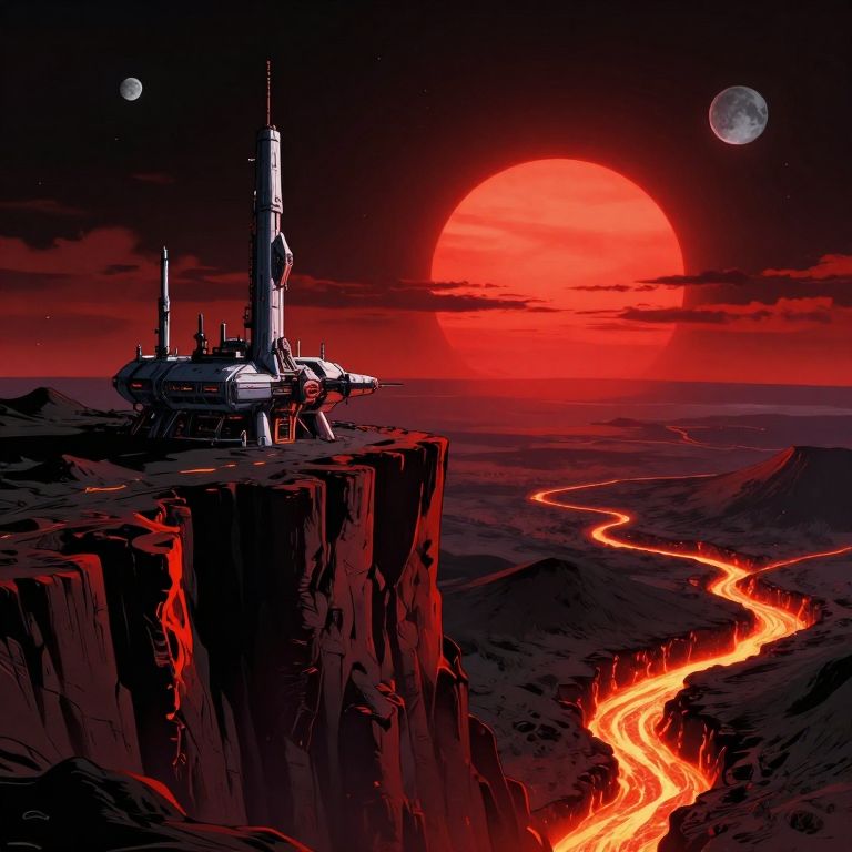 Inkpunk Anime, arid volcanic landscape, Artemis Station perched at the edge of a volcanic cliff, its sleek towers a stark contrast to the cliffs surrounding it, The planet’s sun casts a vivid, surreal light across the station, while deep fissures reveal glowing rivers of molten lava far below, The sky is a surreal shade of black and red, with two moons hanging low in the horizon, each reflecting light off the surface