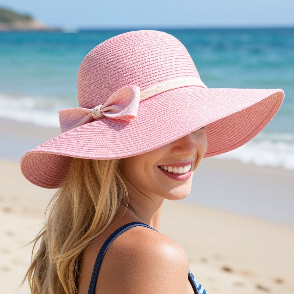 Blonde woman wearing a wide-brimmed pink straw beach hat adorned with a delicate bow knot, smiling brightly against a backdrop of sandy shores and turquoise ocean waters.
