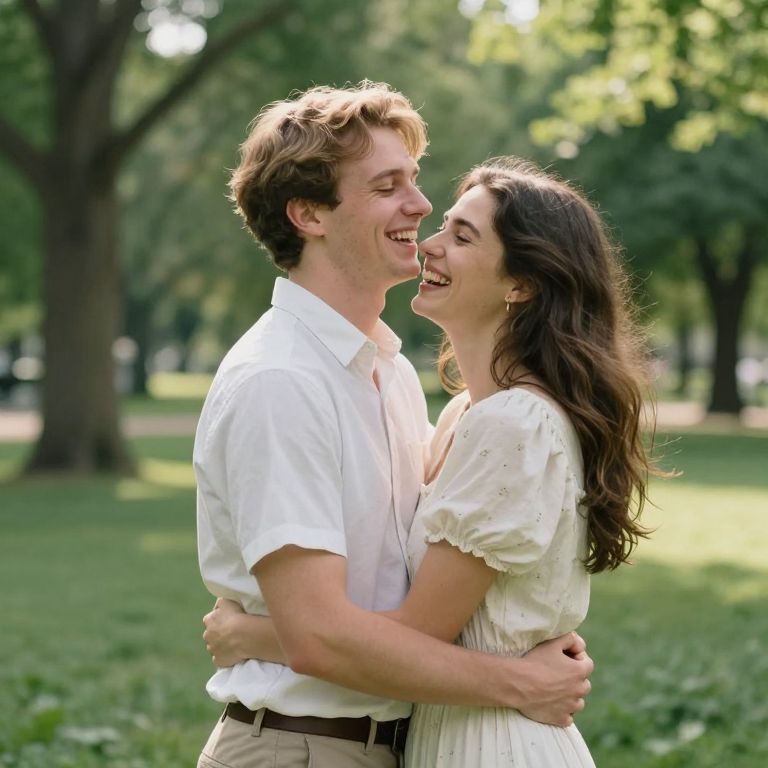 Radiant joy and unspoken connection bloom in the embrace of two souls, their laughter echoing through the verdant whispers of a timeless park.