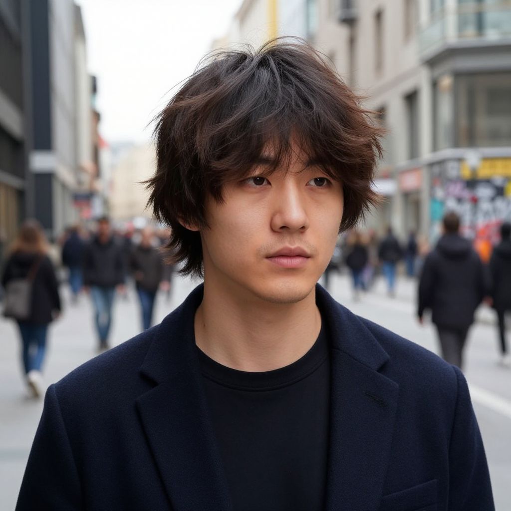 Choppy Fringe, fit European man standing in a modern city street, realistic photography style, natural lighting, detailed facial features and textured hair, urban background with bustling crowd and graffiti walls