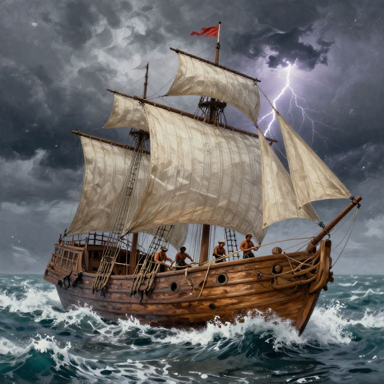 Digital artwork of a wooden sailing ship with three white sails, sailing through rough, dark blue ocean waves under a stormy, cloudy sky. A bright lightning bolt strikes the upper right sail, illuminating it. Six sailors, dressed in brown shirts and pants, stand on the deck. The ship's wood texture is detailed, with ropes and rigging visible. A small red flag flutters at the top of the mast. The scene exudes a sense of danger and adventure, with the turbulent sea and dramatic sky enhancing the dramatic atmosphere.