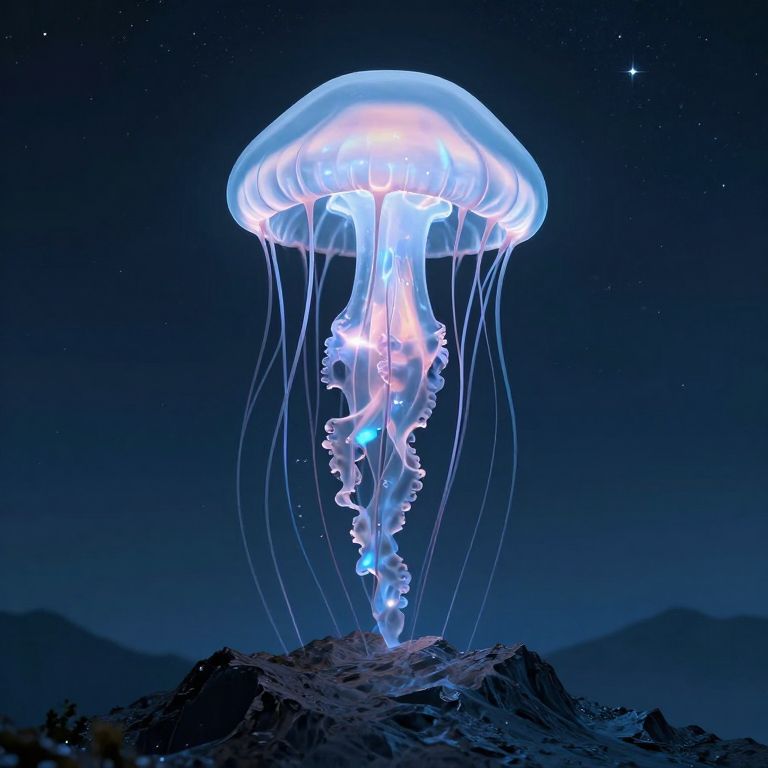 A colossal, translucent jellyfish floats above a mountain peak, its pulsating tentacles drawing energy from the stars.