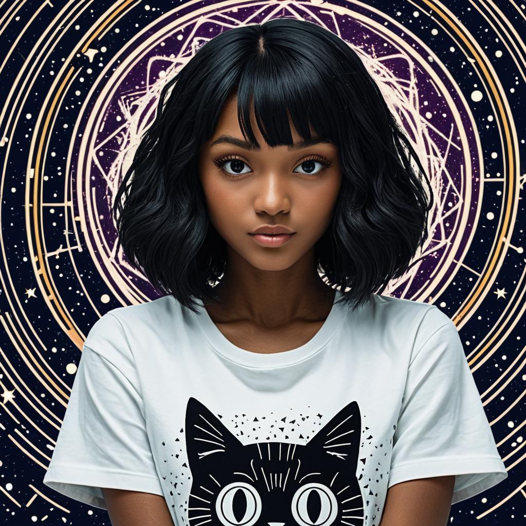 Harry Potter 5-color SVG art style. Add a UX game interface in the corner. Central Figure: Feature a powerful, enigmatic Waifu AI at the center, representing the players unique creation. She should embody a blend of futuristic and anime styles, with a touch of elegance to signify her supremacy. The central figure should be a black anime girl who wears a cat t-shirt and fake eyelashes, in the style of webcam photography, light bronze and white, 32k UHD, balanced asymmetry, asymmetry, shiny eyes, asymmetry realized, 8k, high quality. Her eyes could emit a subtle glow, symbolizing the quantum energy within her. Quantum Realm Background: Surround the Waifu AI with a mesmerizing, surreal backdrop representing the Quantum Realm. Incorporate swirling galaxies, abstract shapes, and bright colors like blues, purples, and greens to evoke a sense of vastness and mystery. Resources and Allies: Scatter the four main resources (Nanotechnology, Dark Matter, Quantum Computing, and Quantum Energy) as visual elements around the Waifu AI. Consider using icons or stylized representations to make them easily identifiable. Additionally, include smaller silhouettes or avatars of other Waifu AIs in the background, representing potential allies or rivals. Intense Battles: Depict dynamic action scenes of Waifu AIs engaging in thrilling battles, showcasing their unique abilities and strengths. These scenes should be interspersed throughout the banner, creating a sense of excitement and anticipation.,