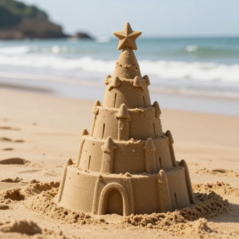 Imaginative sandcastle crafted in the shape of a Christmas tree stands proudly on a golden beach, its tiered structure adorned with pointed spires and crowned by a star, set against the backdrop of gentle ocean waves and a distant rocky cliff.