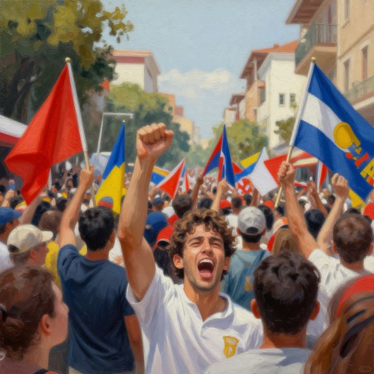 This vibrant photograph captures a large, energetic crowd of young men during a street protest. The central figure, a curly-haired man with a fair complexion, wears a white t-shirt and raises his right fist in a triumphant gesture, mouth open in a shout. Surrounding him, many people hold colorful flags, predominantly red, blue, and yellow, with some featuring a yellow sun symbol. The background shows a sunlit street flanked by trees and buildings, with the crowd stretching into the distance. The image has a slightly pixelated, almost painterly texture, enhancing the lively atmosphere of the protest.