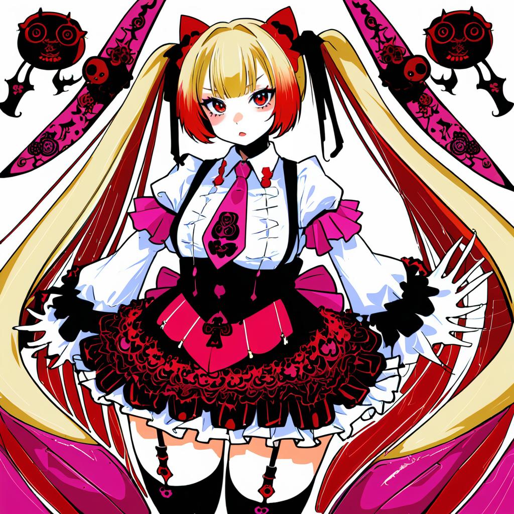 Asmodeus (umineko), umineko no naku koro ni, 1girl, red eyes, blonde hair, long hair, twintails, showgirl skirt, thighhighs, pink necktie, garter straps, by artist aoi ogata, anime