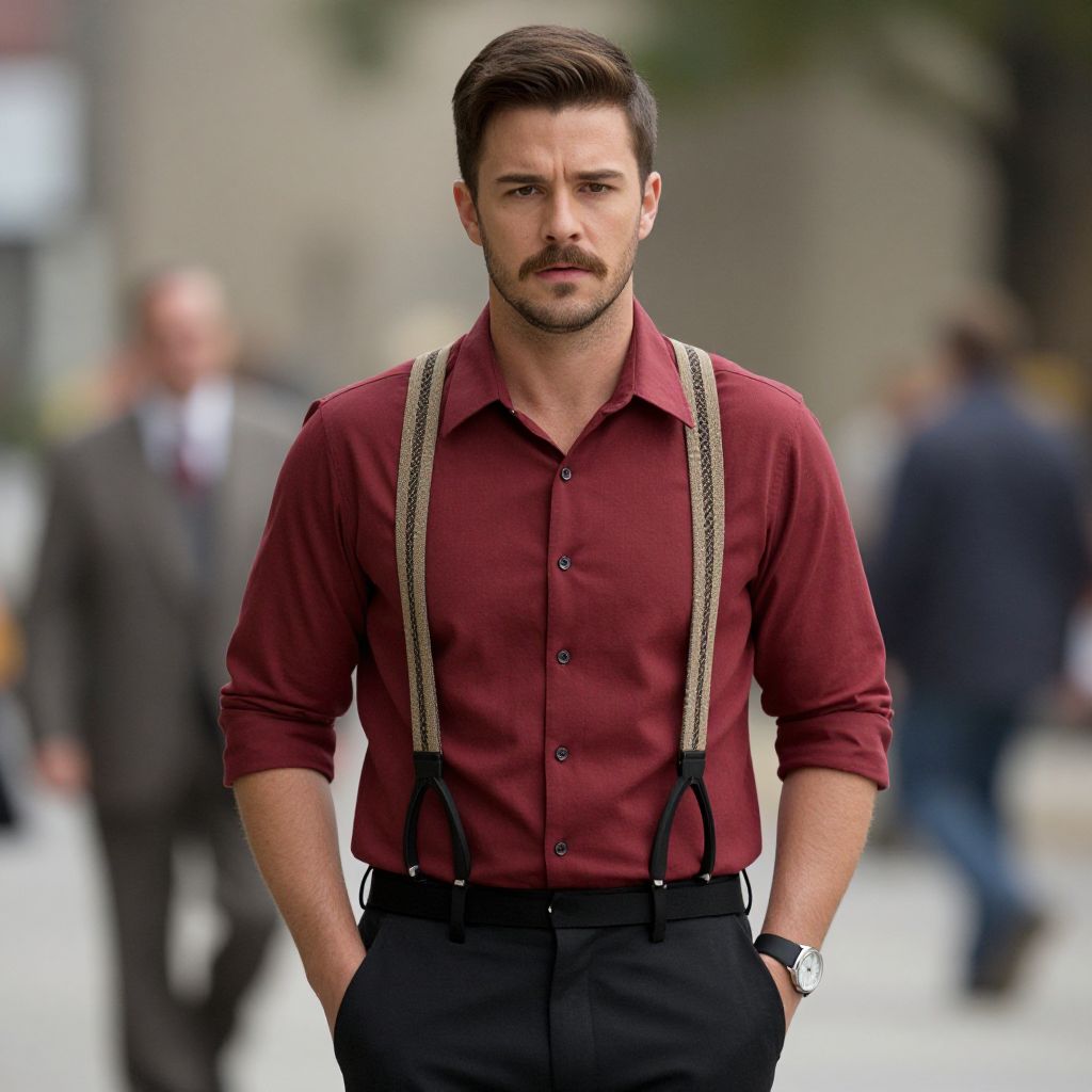 Photograph of a handsome white man with short, dark brown hair and a neatly trimmed beard, wearing a red, button-up shirt with sleeves rolled to his elbows, and black pants with beige suspenders. He has a serious expression, with his hands in his pockets, and a silver watch on his left wrist. The background is blurred, showing an urban street with indistinct figures in suits, trees, and buildings. The lighting is natural, suggesting daytime. The man's physique is fit, with broad shoulders and a muscular build. The overall style is modern and slightly vintage.