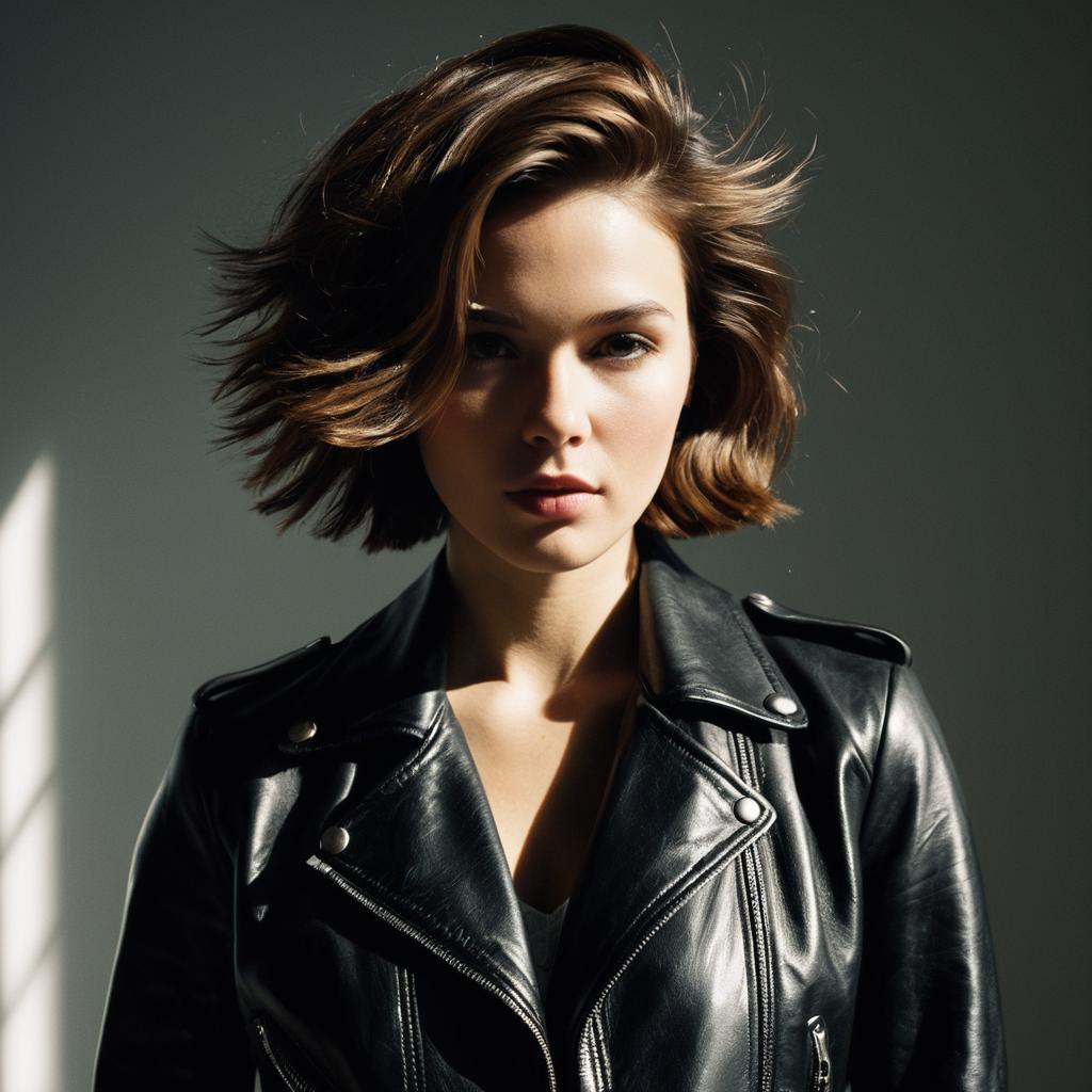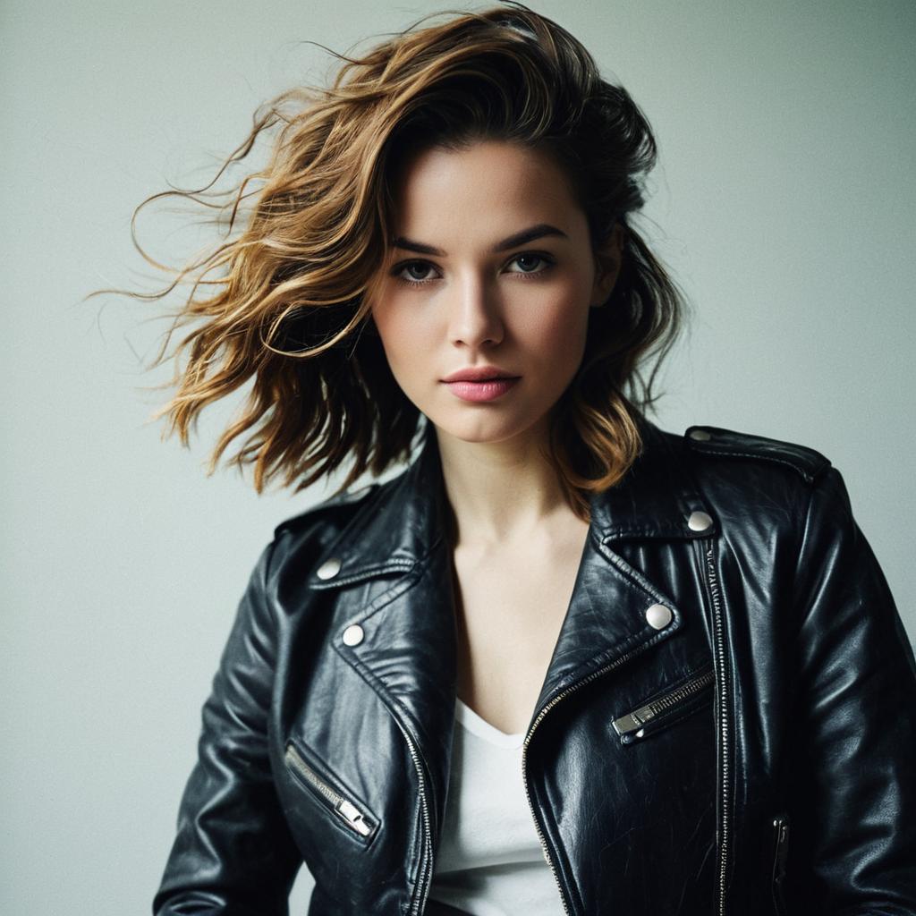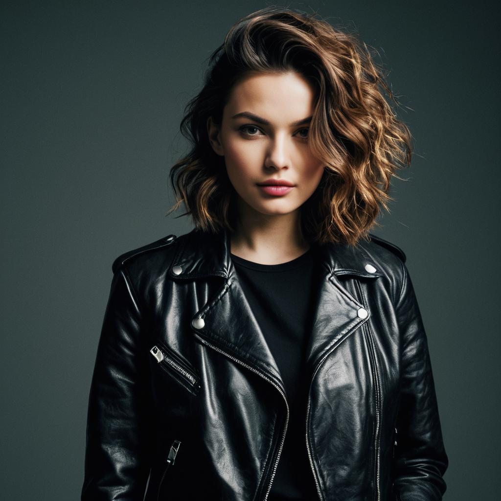 Fashion Model with Layered Waves Hairstyle in Leather Jacket