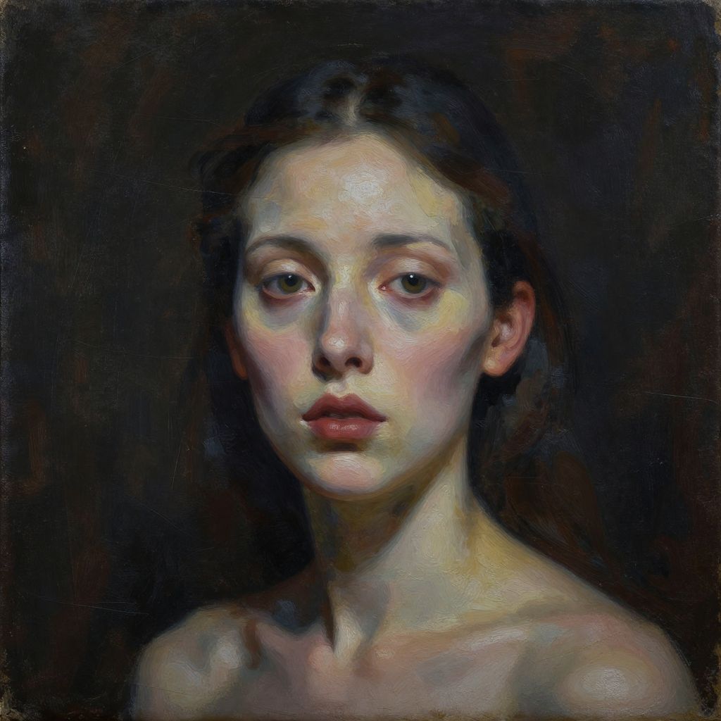 Realistic oil painting of a young woman with pale skin, dark brown hair, and solemn expression, set against a dark background.