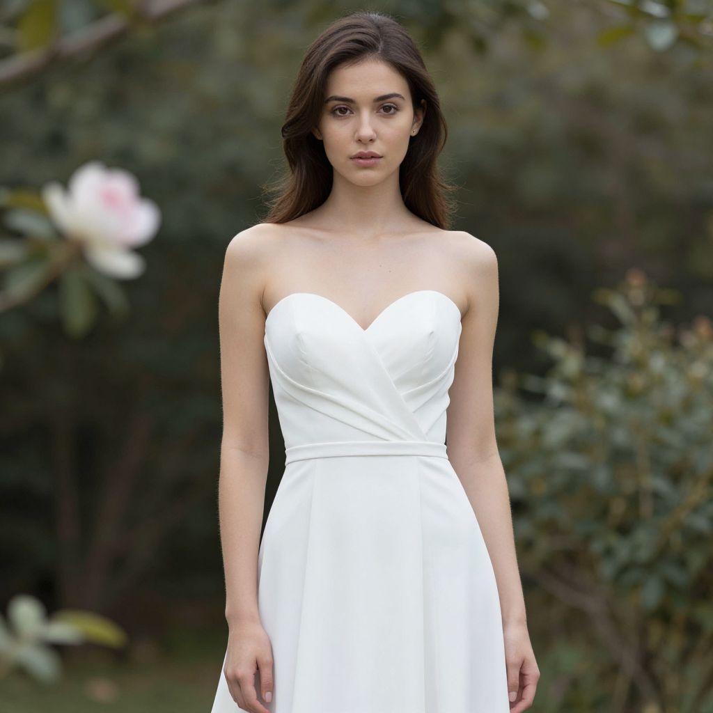 Pretty white wedding dress, 1girl, solo, dress, white dress, breasts, looking at viewer, flower, blurry, blurry background, long hair, cleavage, bare shoulders, brown eyes, medium breasts, standing, brown hair