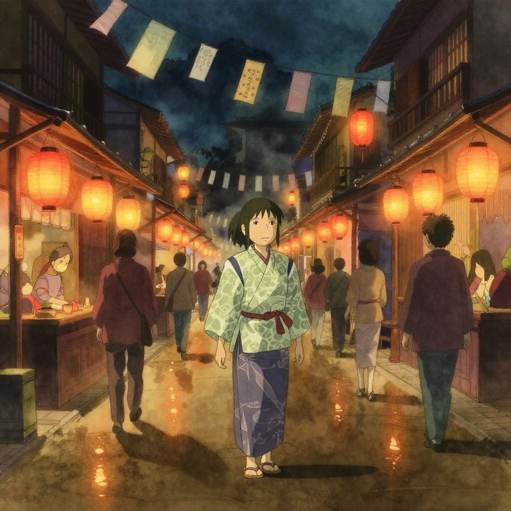 Spirited Away-inspired fantasy at a lantern-lit marketplace street bustling with shadows; a middle-aged woman wearing a patterned noragi jacket stands amid glowing lanterns and fluttering paper talismans. watercolor and light ink outlines aesthetic with delicate linework, soft edges, and subtle washi texture. Cinematic composition with leading lines and a clear vanishing point, warm amber and teal grading, volumetric light, gentle fog, soft bokeh, polished wood reflections, high detail, subtle film grain, calm, wistful mood.