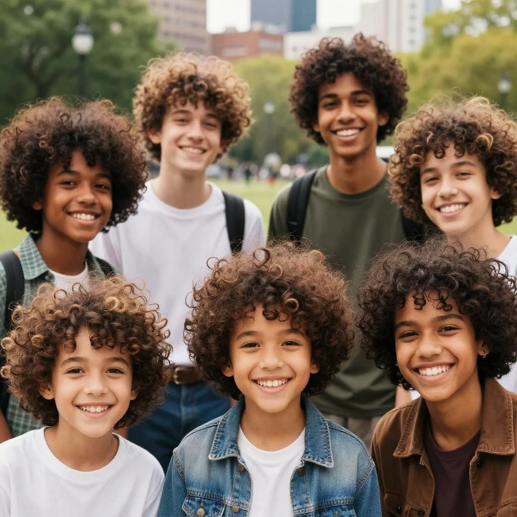 Photograph of seven smiling, young Black boys with large, curly brown hair. They stand outdoors in a park, with green trees and blurred city buildings in the background. The boys wear casual clothing: white, green, and denim shirts, with backpacks. Their diverse expressions of joy and camaraderie are prominent. The image has vibrant colors, with the boys' hair and clothes contrasting against the greenery. The photo captures a sense of youthful exuberance and unity.