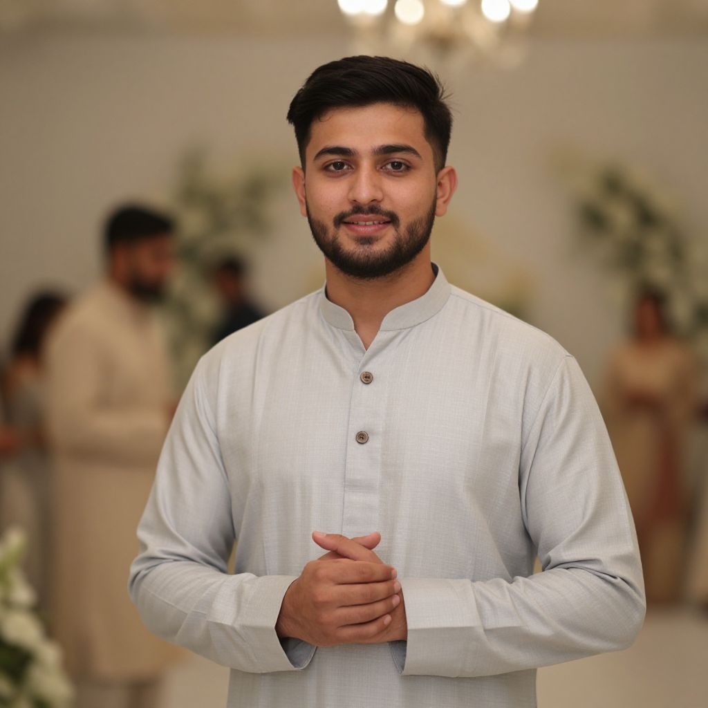 Shadi party wear dress male, 1boy, male focus, solo, facial hair, beard, black hair, looking at viewer, indoors, mustache, blurry, smile, own hands together, buttons, blurry background, long sleeves, short hair, standing