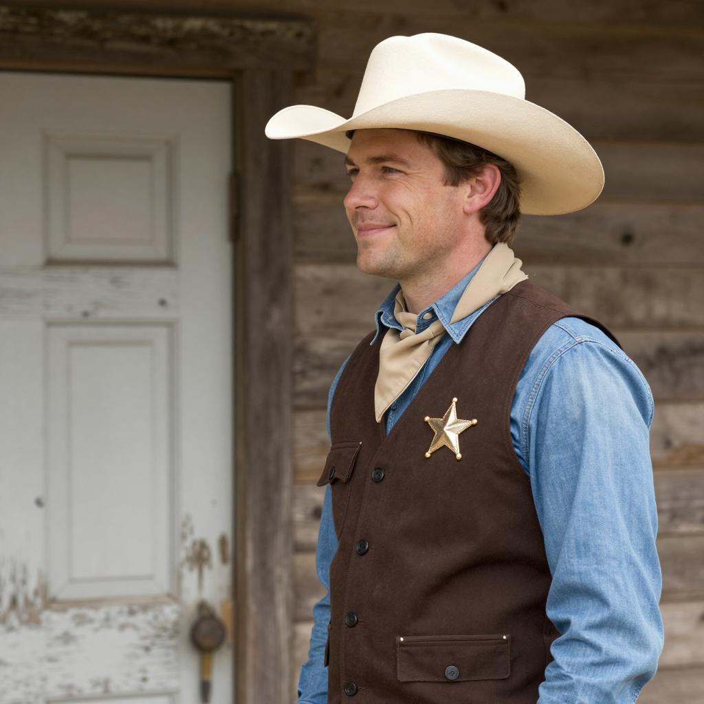 Man in a beige cowboy hat, brown vest over blue shirt, beige scarf, and sheriff's star, standing beside a worn, chipped wooden door. Background includes a wooden wall and door. Side profile, smiling. Light brown hair, fair skin. Casual, western attire.
