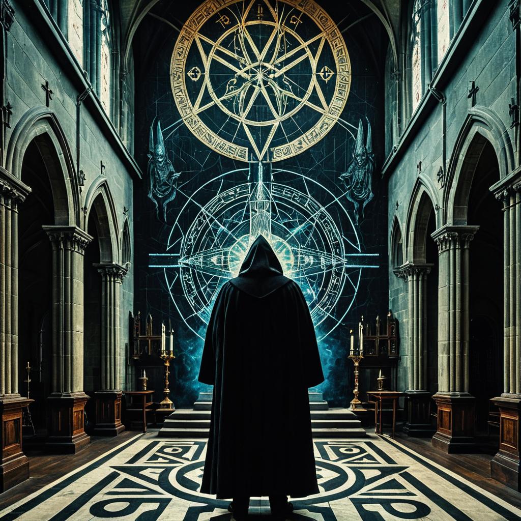 A figure wearing a black hooded cloak stands in the center of a gothic-style church with high arches and stone columns. Behind them is a large illuminated wall adorned with mystical and occult symbols, including a golden pentagram and intricate magical circles. The scene is enhanced with neon lighting and surreal, symbolic elements evoking themes of chaos magick and ritualistic summoning.