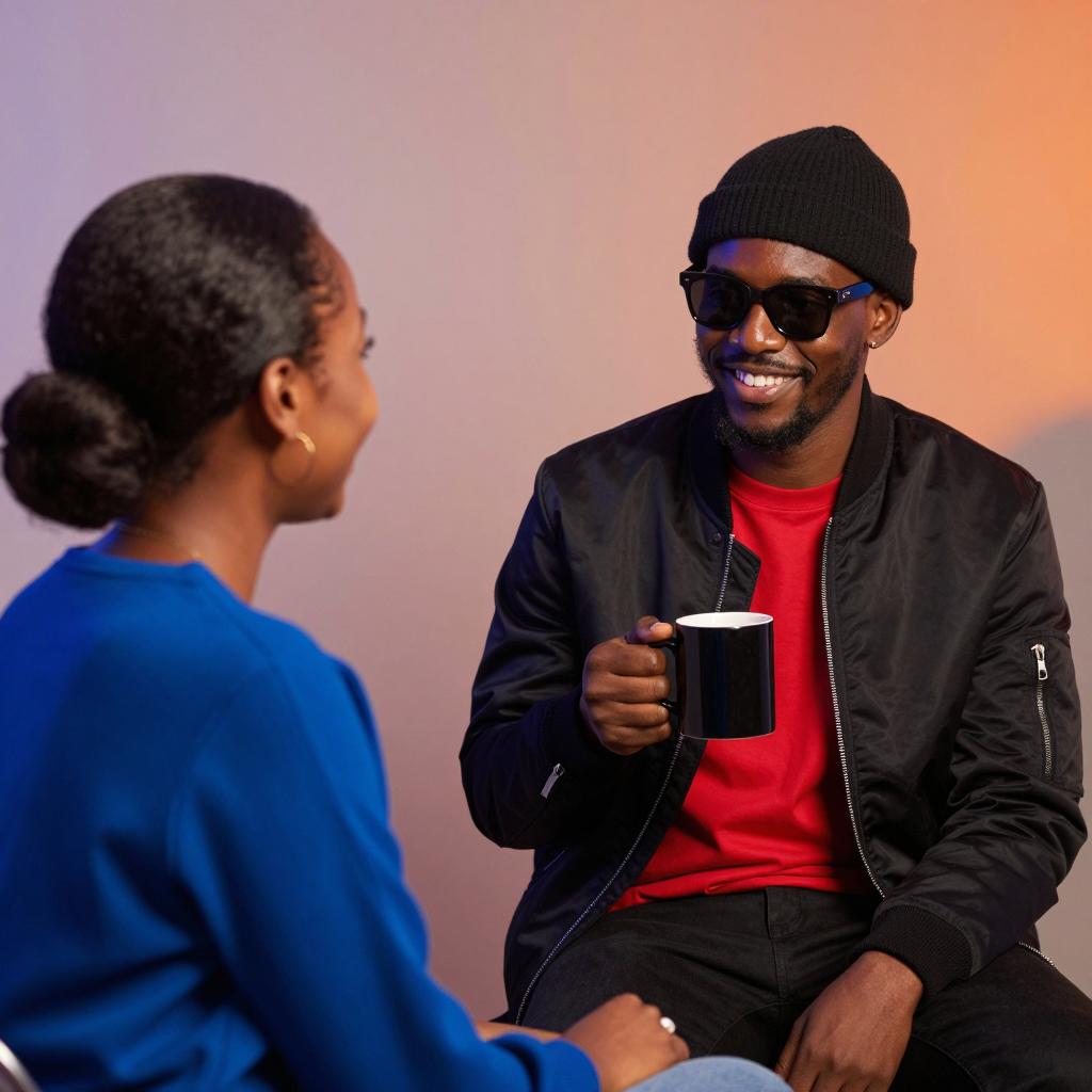 Two people in conversation. Man with dark skin, black beanie, sunglasses, red shirt, and black jacket holds a black mug, smiling. Woman with dark skin, blue top, black hair in bun, back to camera. Background has orange and blue lights. Man seated on the right, woman on the left. Man's right hand holds mug, left hand on lap.