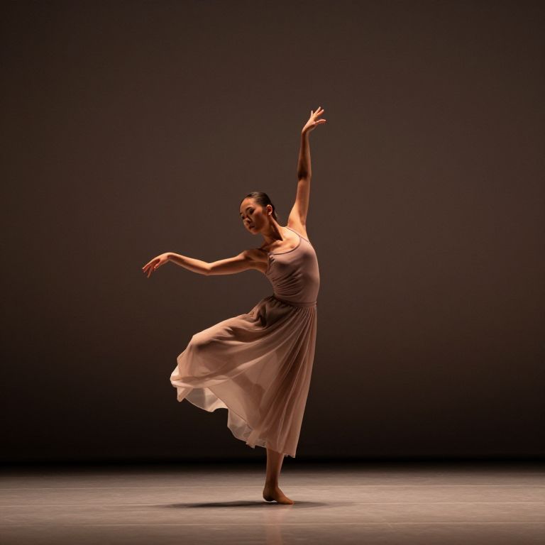 Photograph of a graceful dancer in a flowing, beige, sleeveless dress, performing a ballet pose with arms extended, against a dark, spotlighted