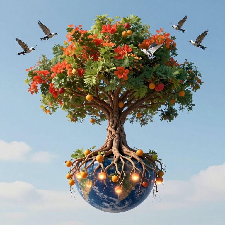 Digital artwork of a tree with red-orange flowers and orange fruits, roots growing from a floating Earth, surrounded by flying birds against a blue sky.