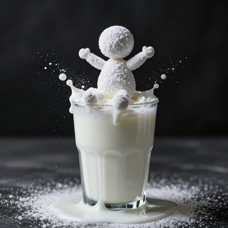 A whimsical, sentient powdered-sugar figure perches atop a frothy glass of milk, its form dissolving gracefully into the creamy liquid below, creating a surreal dance between solid and liquid in a dreamlike tableau.