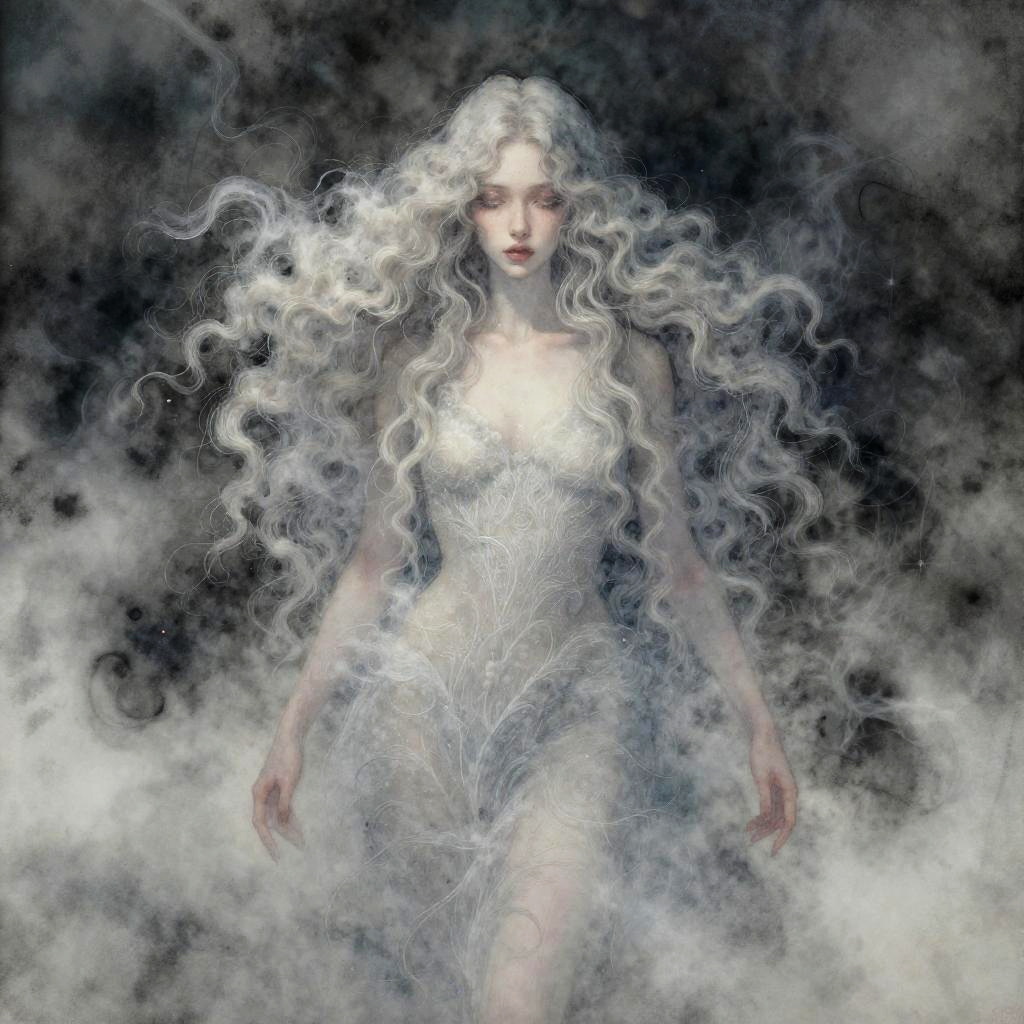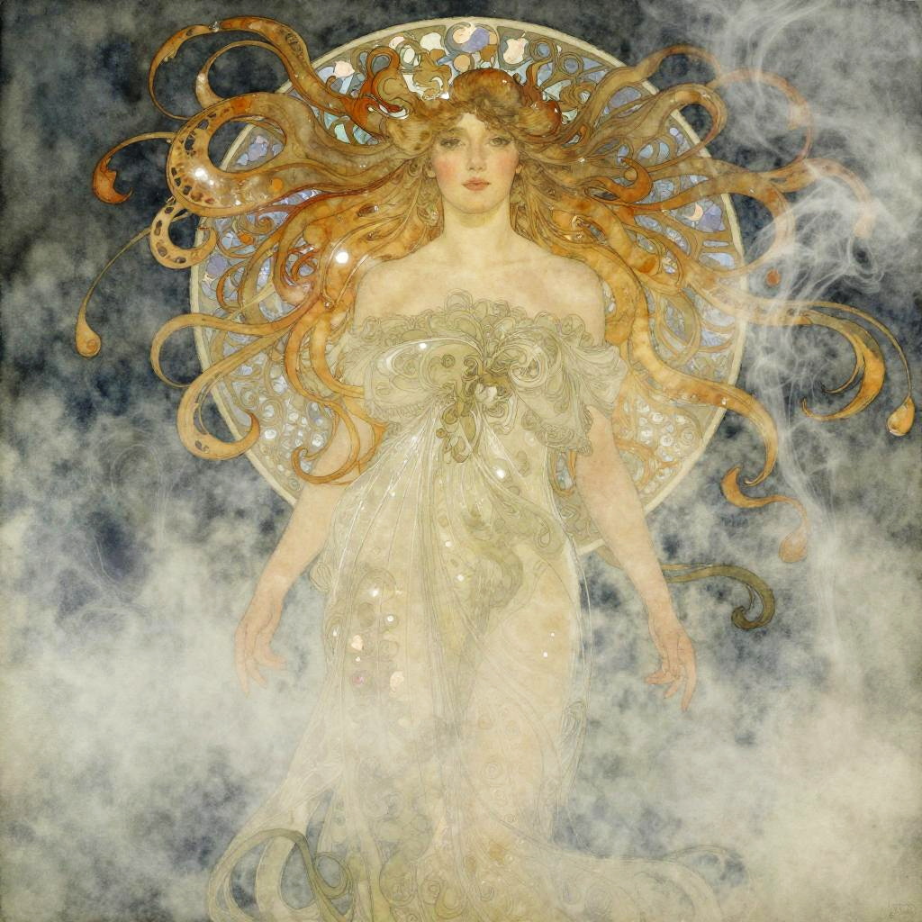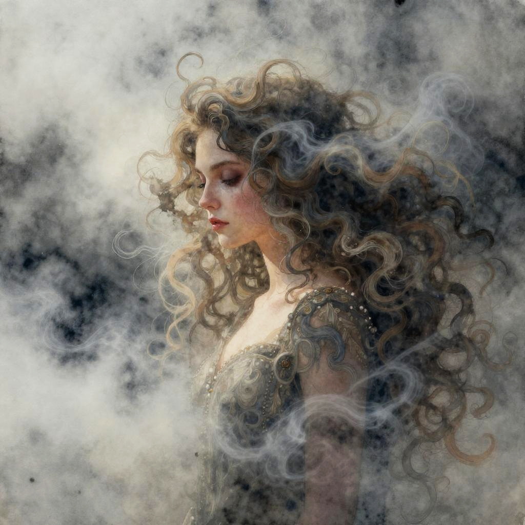 A hauntingly beautiful luminous siren surrounded by fog and smoke, her hair a cascade of clouds. Inspired by Lois van Baarle, John William Waterhouse. Aquarelle watercolors with glowing reflections, intricate details, and iridescent highlights.