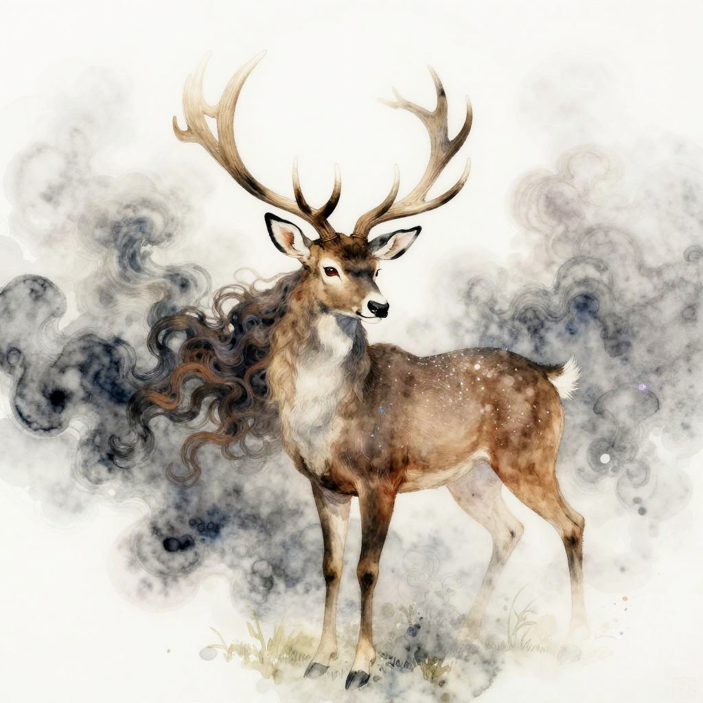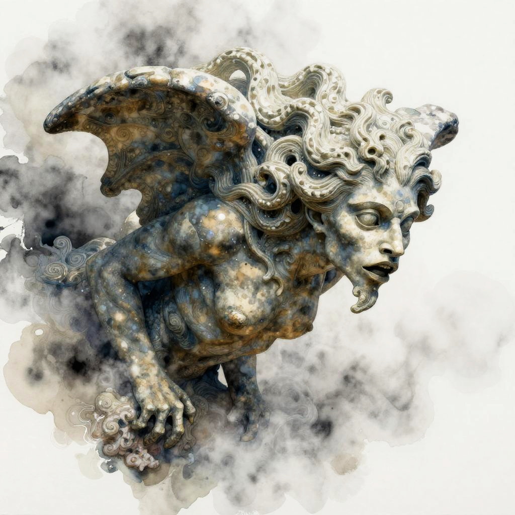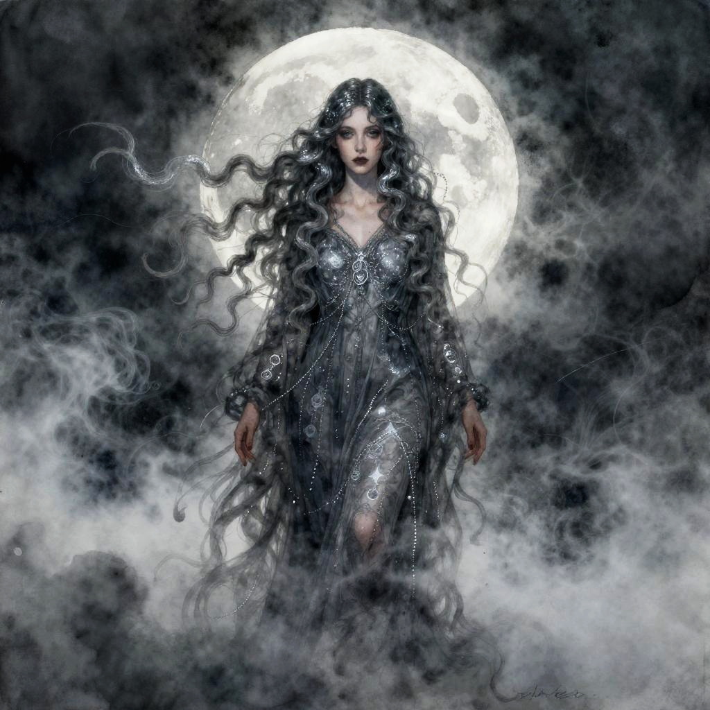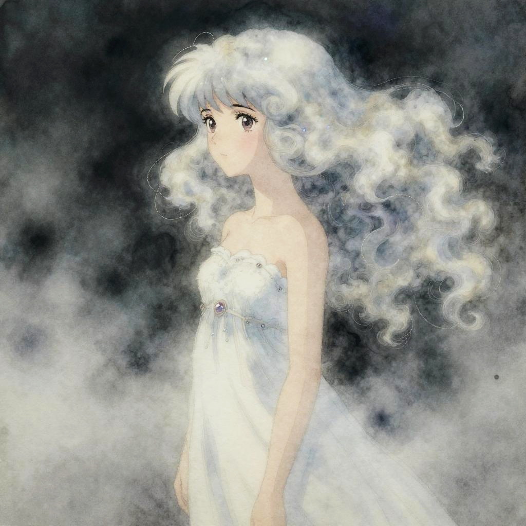 A hauntingly beautiful luminous siren surrounded by fog and smoke, her hair a cascade of clouds. Inspired by Lois van Baarle, John William Waterhouse. Aquarelle watercolors with glowing reflections, intricate details, and iridescent highlights.