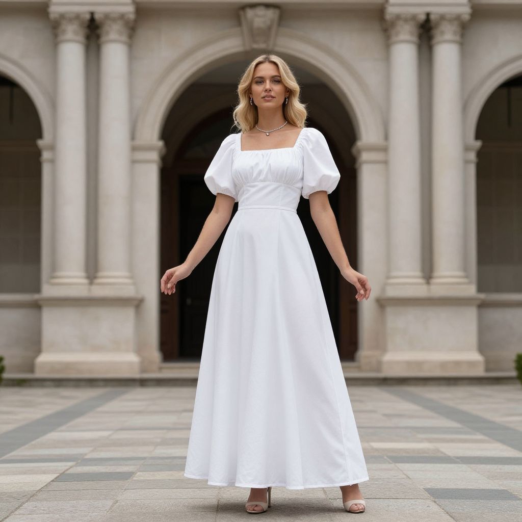 Photograph of a blonde woman with wavy hair, wearing a white, knee-length, short-sleeved dress with a square neckline. She is standing in front of a classical stone building with arched doorways and columns. The dress has a subtle sheen and she wears simple, silver jewelry, including a necklace. Her hands rest gently at her sides, and she is wearing beige, open-toed heels. The background consists of a checkered stone pavement and the building's pale, textured stone facade. The overall composition emphasizes elegance and simplicity.