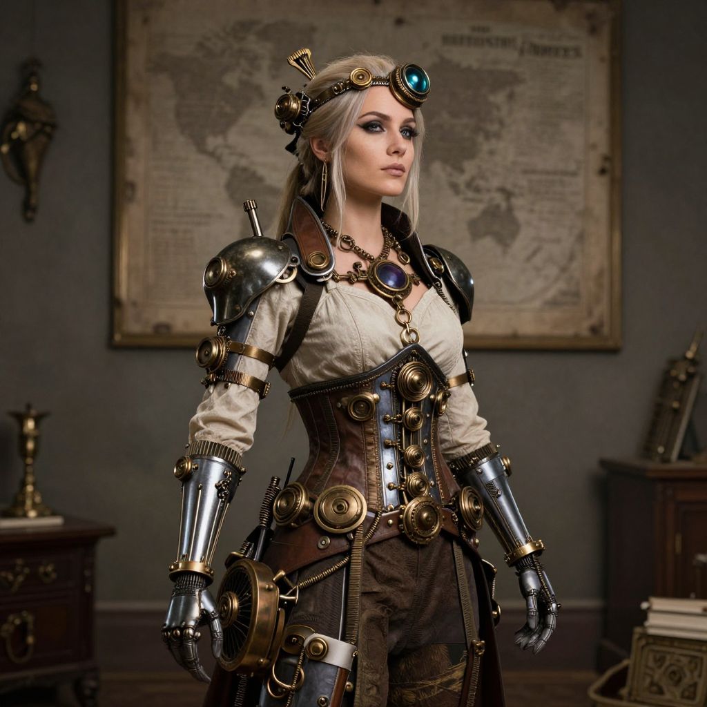 Embracing the weight of history and the promise of progress, a steampunk assemblage woman stands resolute, her mechanical adornments whispering tales of resilience and the eternal dance between past and future.