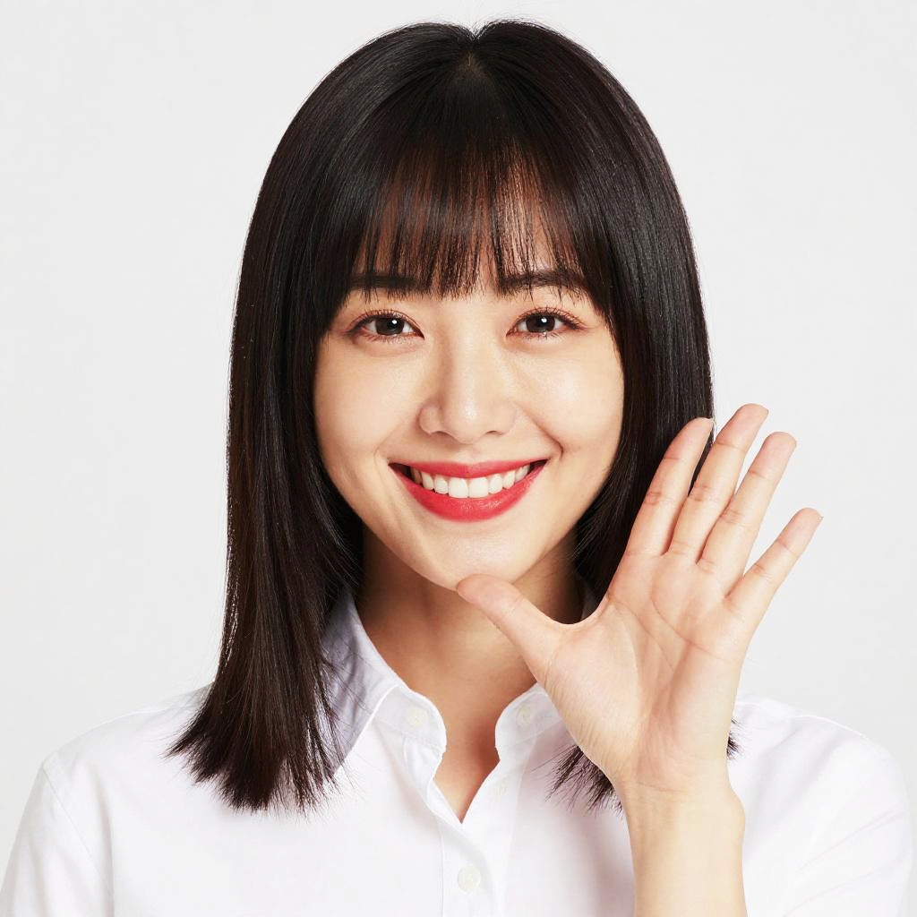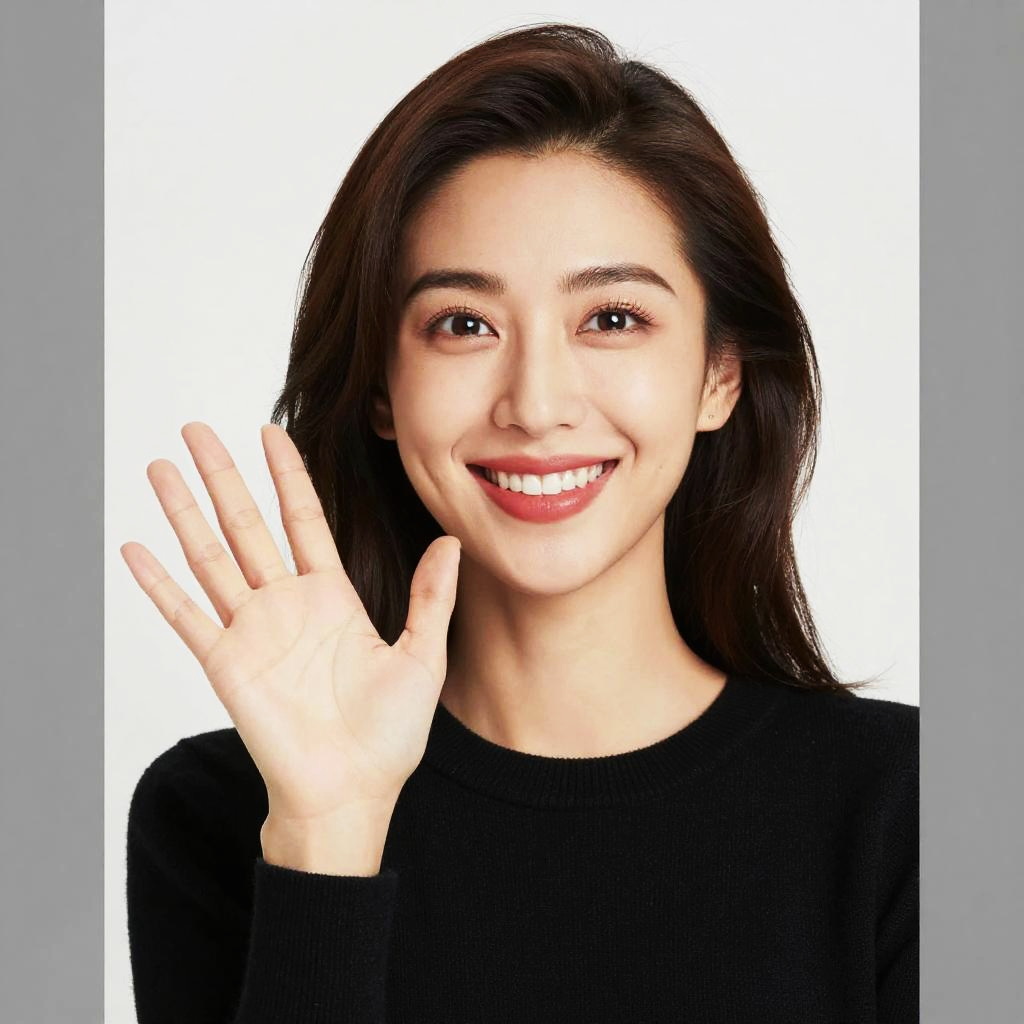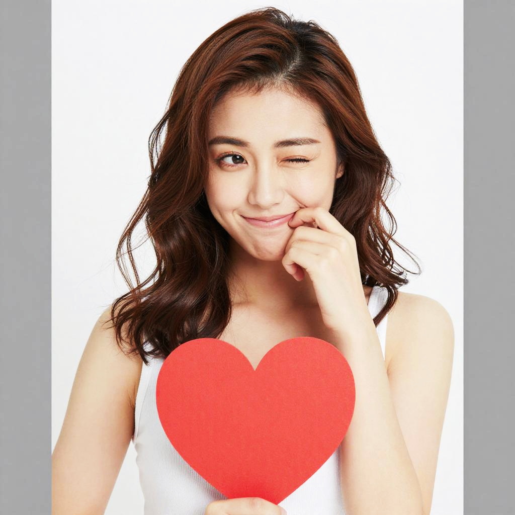 Portrait of a cute Asian woman with short, wavy black hair, wearing a white tank top, holding a large red paper heart in front of her face. She has a playful and gentle expression, set against a stark white background with gray borders on the sides.