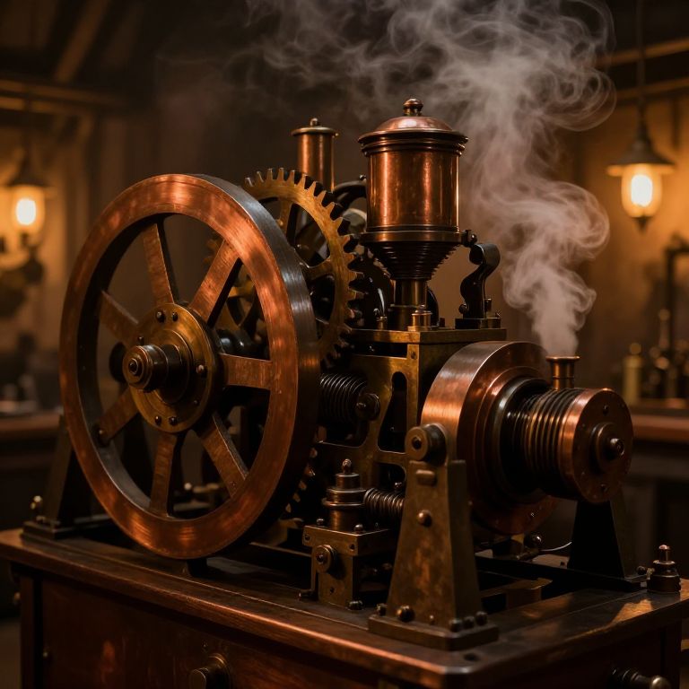 Harnessed steam power driving an intricate mechanical contraption in a Victorian steampunk workshop, gears and pistons in motion, warm amber lighting, filled with detail, copper and iron textures, atmospheric with a slight haze of smoke and steam.