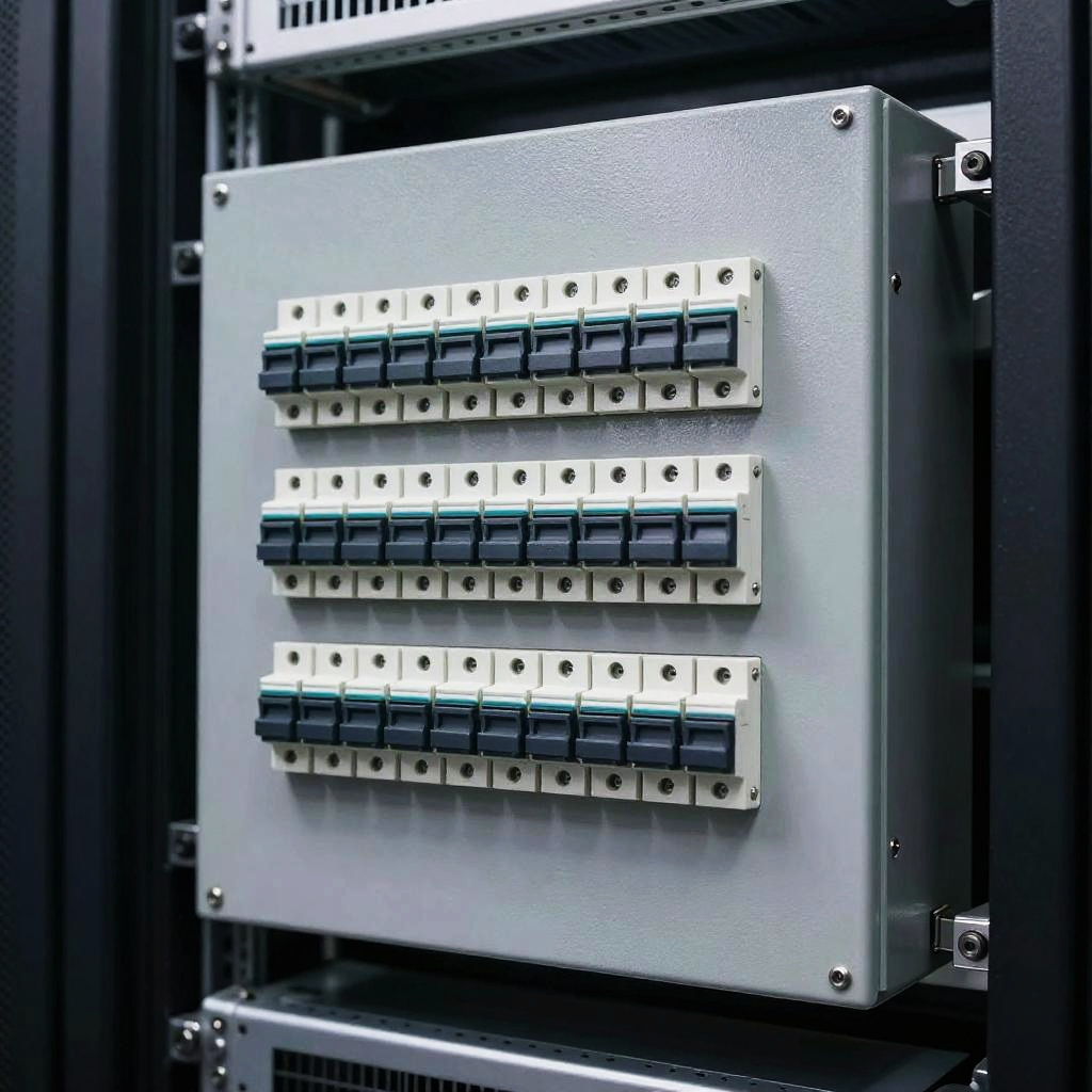 A compact elektroschrank mounted on a wall in a high-tech server room, showing multiple switches and circuit breakers, subtle reflections on its surface, soft shadows, emphasizing precision engineering and safety standards.