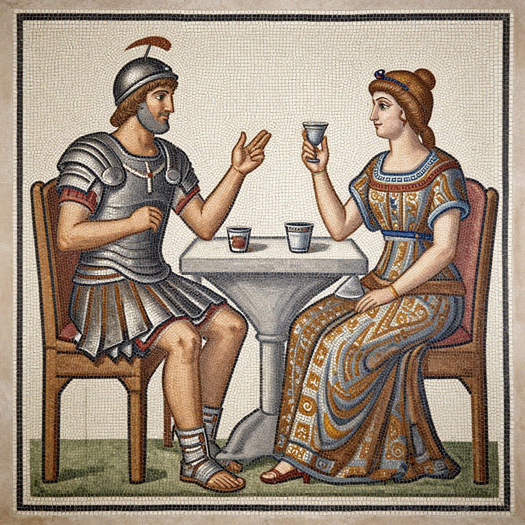 A Roman mosaic depicts a soldier in armor conversing with a woman in an ornate dress, both seated at a table with cups.