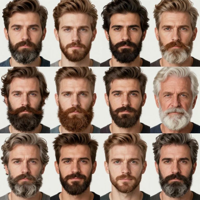Beard styles without mustache, a visual exploration of masculine grooming focusing on beard lines and shapes sans mustache, depicted on diverse faces with different ethnicities and age groups, in a photorealistic style with emphasis on hair texture and facial contours.