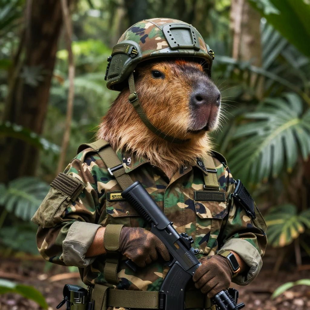 Military capybara wearing camouflage uniform and helmet, standing confidently in a lush jungle, detailed fur texture, realistic lighting, heroic pose