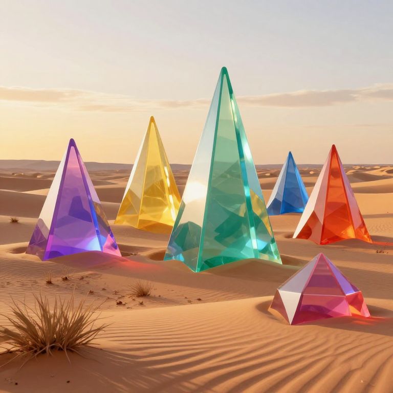 Photograph of six vibrant, translucent crystal pyramids in purple, yellow, green, blue, red, and pink, standing in a sunlit desert
