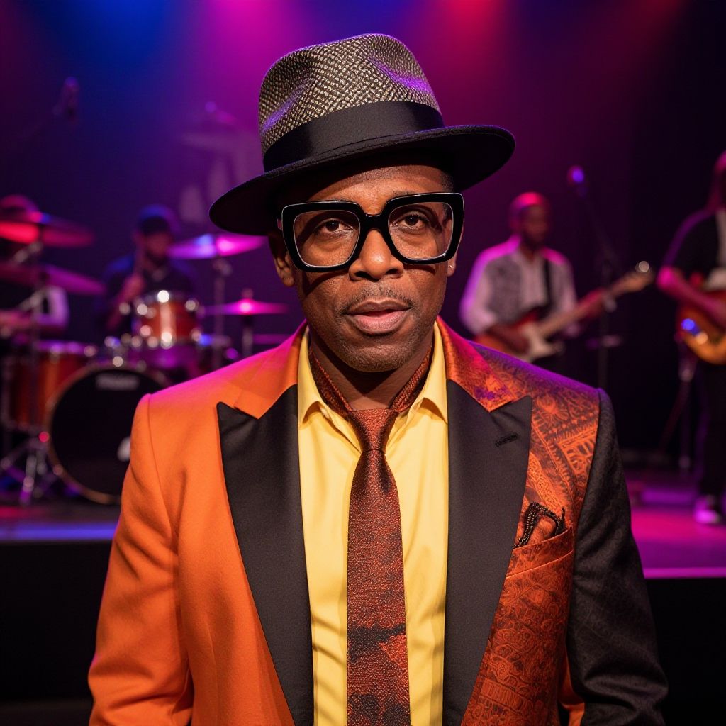 Photograph of an African-American man with dark skin, wearing a vibrant orange and black patterned suit jacket, a yellow dress shirt, and a brown, textured tie. He sports a black, sparkly fedora hat and large, black-rimmed glasses. The background is a dimly lit stage with purple and pink stage lights, and blurred musicians playing instruments, creating a lively, musical atmosphere. The man's expression is calm and confident, and the image has a vivid, colorful, and slightly dramatic style.