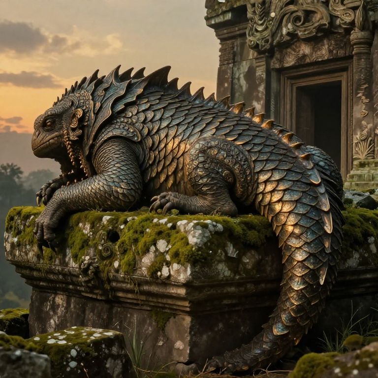 Bubous creature resting on ancient ruins at dusk, mysterious and majestic, with moss-covered stone and soft golden light, intricate textures on bubous scales, vintage fantasy art style, atmospheric shadows and subtle highlights.