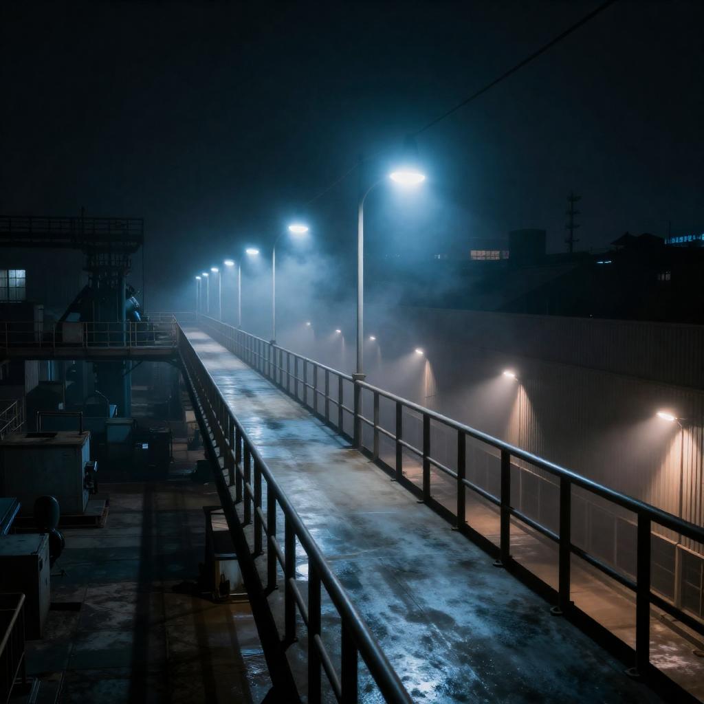 A high-contrast, cinematic photograph of a dark, industrial scene with bright blue and white lights illuminating a long, elevated walkway. Smoke and light reflections create a dramatic atmosphere. The background features dimly lit buildings and machinery. The walkway extends diagonally from the bottom left to the top right, with intense light sources at the center.