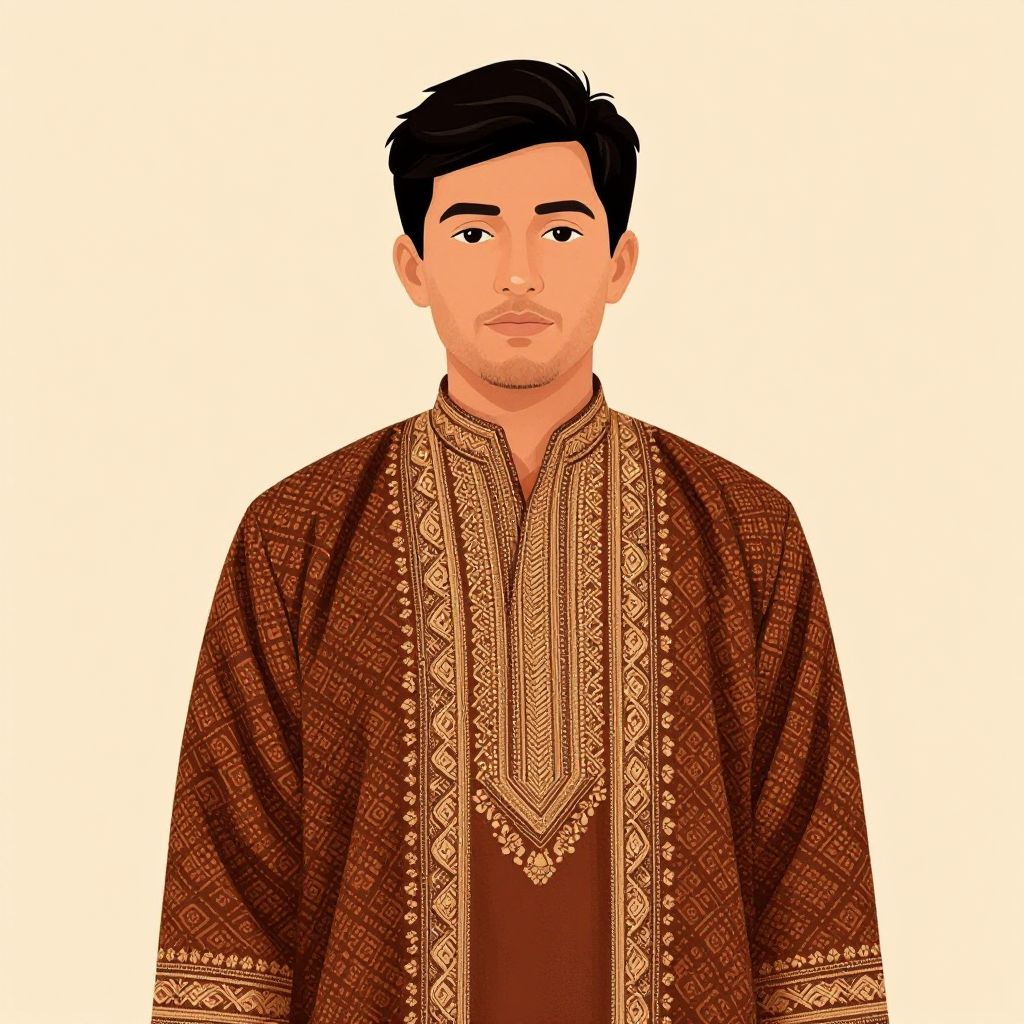 This is a digital illustration of a young man with short, black hair and light brown skin, facing forward. He wears a traditional brown shalwar kameez adorned with intricate gold patterns along the front and sleeves. The garment has a high collar and is buttoned at the top. His expression is neutral, with slightly parted lips and large, dark eyes. The background is plain white, making the subject the focal point. The illustration uses a flat, vector art style with bold colors and clean lines, emphasizing the cultural attire and the man's calm demeanor.