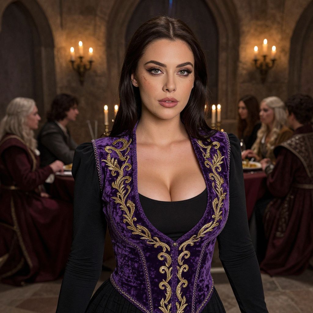 A confident woman in her late 20s with dark brown hair, sharp green eyes, and a subtle smudge of makeup sits in a dimly lit medieval banquet hall, wearing a detailed purple suit vest as part of a fantasy costume. The vest is made of velvet with intricate gold embroidery and hangs over a fitted black dress, giving a bold contrast. The setting features candlelight flickering on stone walls, surrounded by other costumed guests, creating a magical and immersive atmosphere.. The woman has big breasts and cute face