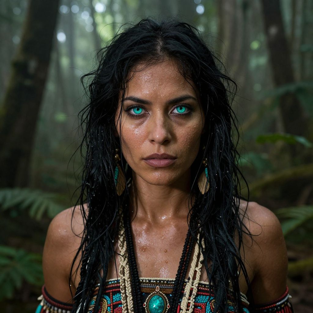 A highly realistic portrait of a shaman, a woman with piercing turquoise eyes, emerges from the backdrop of a dense, fog-shrouded rainforest. Render her with hyperrealistic detail, capturing the intricate patterns woven into her tribal attire and the sweat glistening on her brow under the intense, dappled sunlight of the forest canopy. Her gaze is intense and powerful, locking eyes with the viewer. Her expression conveys a blend of ancient wisdom and modern intrigue. Wild, untamed black hair frames her face, enhancing the air of profound spirituality that emanates from her very being, as if the secrets of the universe lie within her captivating eyes.
