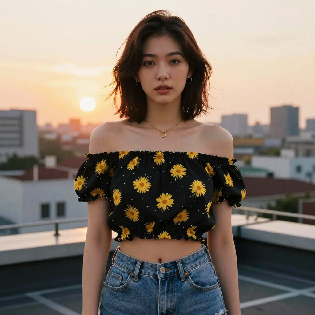 A woman in a casual summer style, wearing an off-the-shoulder black crop top with a yellow flower print and denim high-waist shorts, standing on a city rooftop at sunset, in the visual style of Shogakukan. Sexy. Pretty face and beutiful eyes