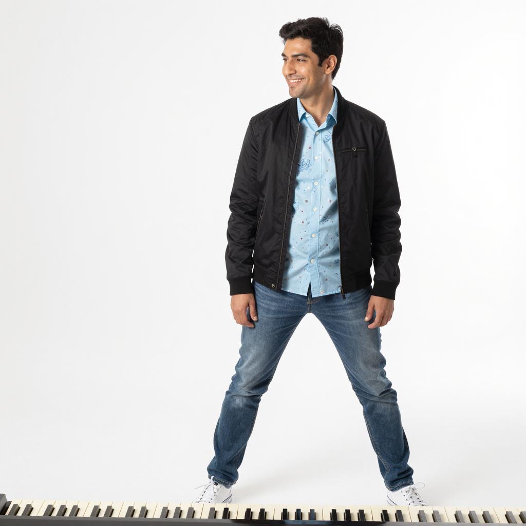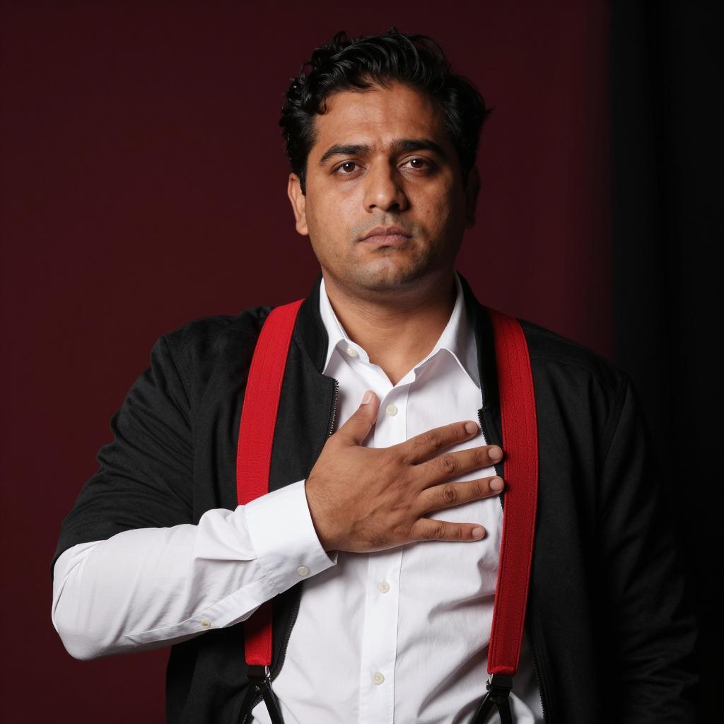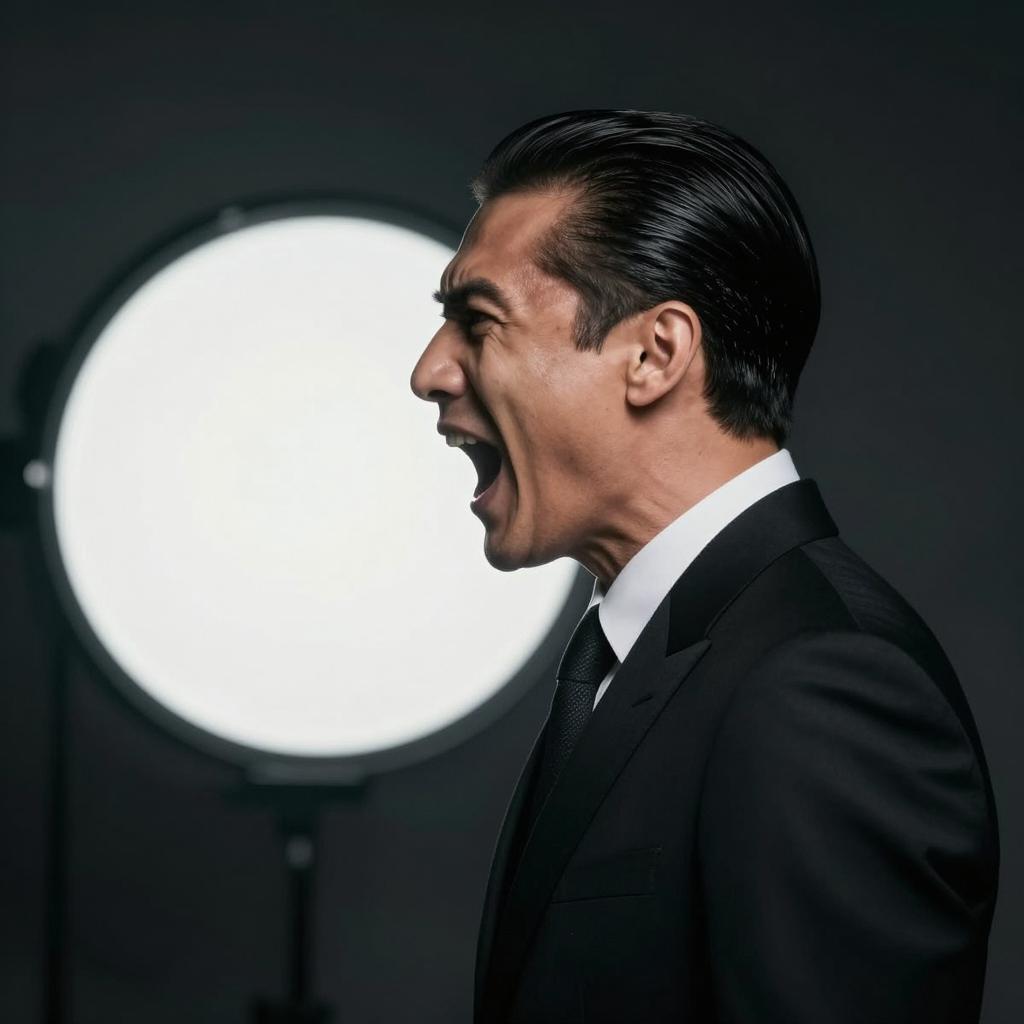 Man with dark hair, medium build, wearing a patterned shirt and dark blazer, shouting into a microphone, eyes closed, mouth open wide. Hands raised to ears. Blurred older man with glasses in background. Colored lights in the background. Live performance.
