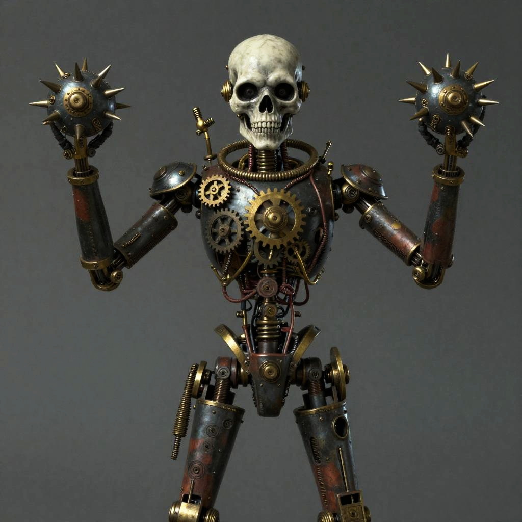 A digital CGI image depicts a skeletal, humanoid robot with a white skull head, dark metallic limbs, and torso adorned with gold gears and spikes. The robot's arms are raised, each holding a spiked, golden ball. Its chest features a prominent gear, and a small cross hangs from its neck. The background is a solid, dark gray, highlighting the robot's intricate, steampunk-inspired design. The robot's limbs have a mix of shiny and rusted textures, adding to its mechanical, industrial appearance. The image has a dramatic, high-contrast lighting effect.