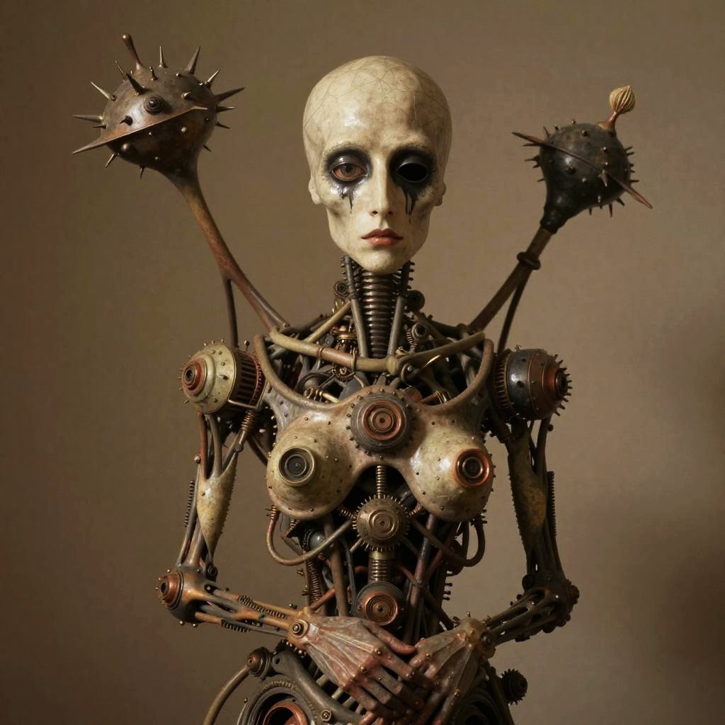Photograph of a creepy, steampunk-style humanoid figure with a pale, skull-like face and dark eye sockets. It has an intricate mechanical body, featuring gears, wires, and brass accents. The figure holds two spiked, spherical devices in its raised arms. The background is a plain, muted gray, making the figure the focal point. The overall vibe is dark and eerie.