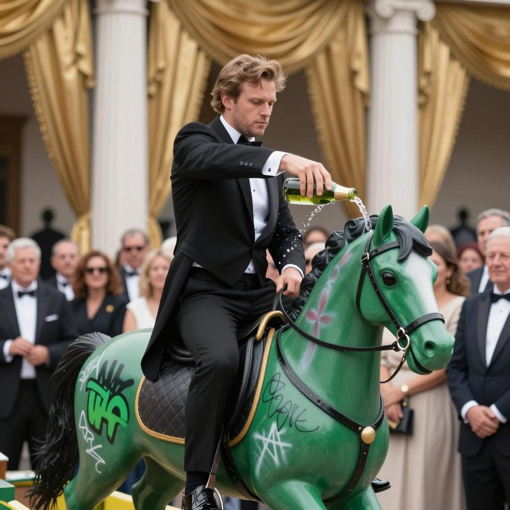 A man in a black tuxedo with a bow tie rides a green, graffiti-covered horse-shaped float, pouring champagne. He faces right, extending his arm forward. A crowd of people, dressed in formal attire, watches intently. The background features ornate white columns and golden drapes. The man's expression is focused. The float has green and black graffiti with visible letters. The image has a realistic, photographic style.