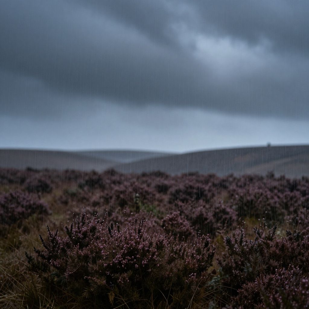 Photograph of a dark, moody landscape with purple heather bushes in the foreground, under a cloudy, rain-filled sky with distant rolling hills.