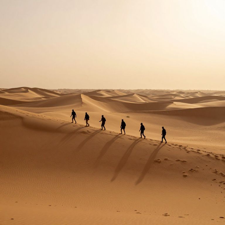 Golden sands stretch endlessly under a hazy sky, with six silhouetted figures climbing a dune ridge, their shadows elongated by the setting sun that bathes the desert in warm, golden hues.