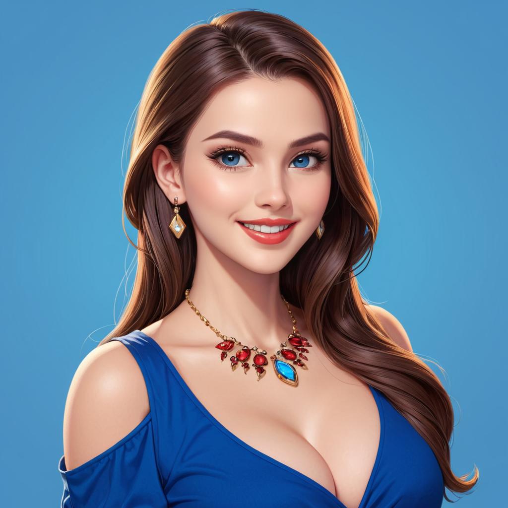 1girl, solo, breasts, blue eyes, brown hair, cleavage, makeup, jewelry, earrings, upper body, long hair, lipstick, shirt, medium breasts, smile, looking at viewer, red lips, blue shirt, blue background, eyeshadow, eyelashes, lips, short sleeves, stud earrings, simple background